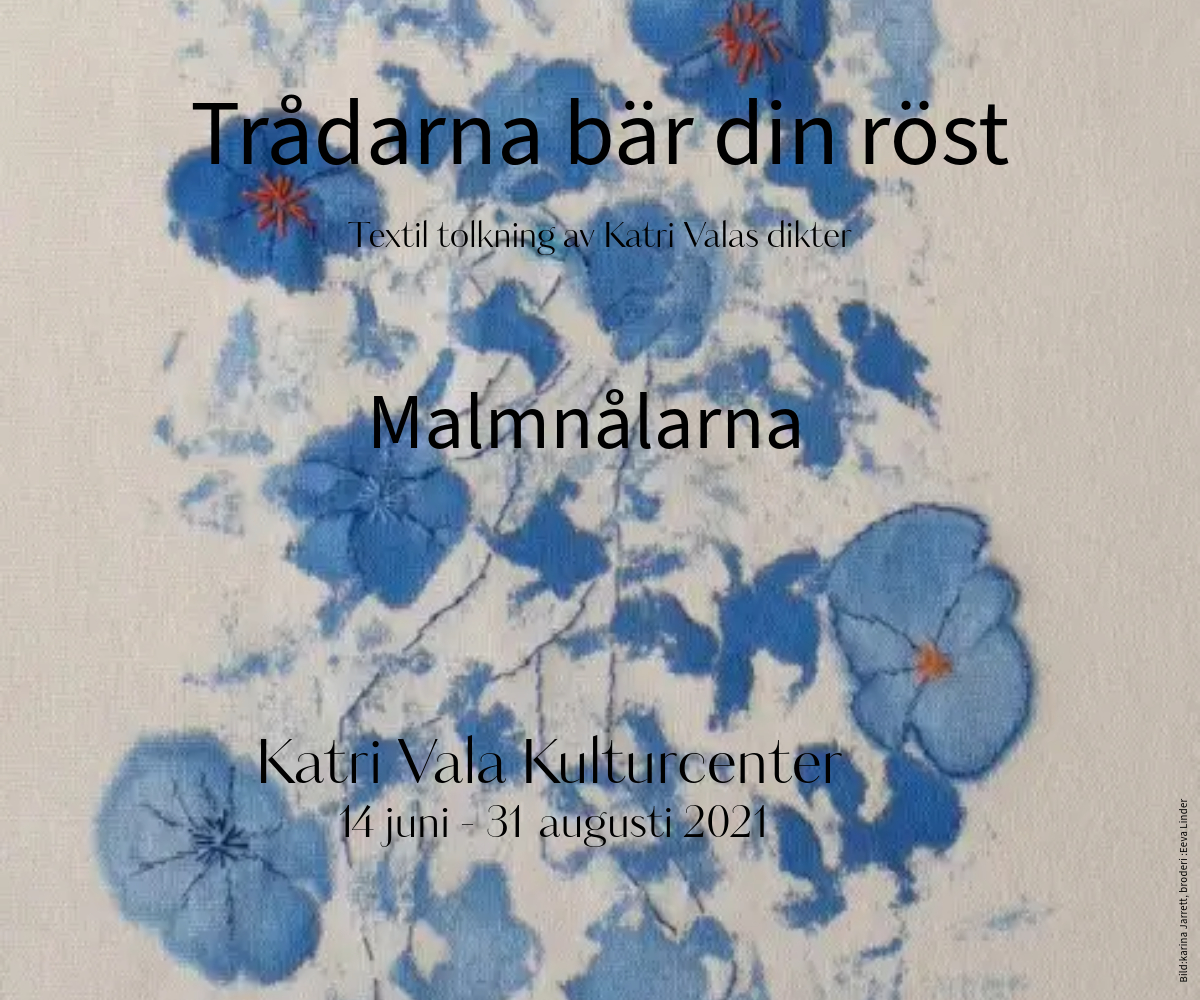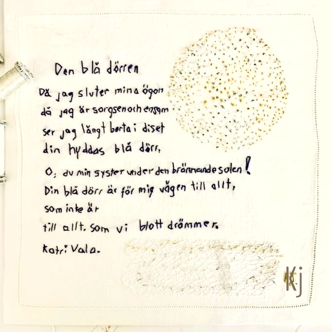 Broderi är ett långsamt och lyckosamt intresse som lede oss till Katri Valas litterära produktion och ett samarbete med Katri Valas kulturcenter i lIIomantsi, Finland. Katri Valas dikter bär på ett bildspråk som vi ville tolka och gestalta i textila arbeten. Projektet startade hösten 2020 och avslutades under hösten 2021.
